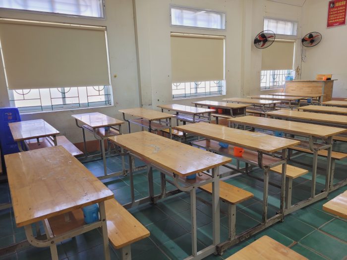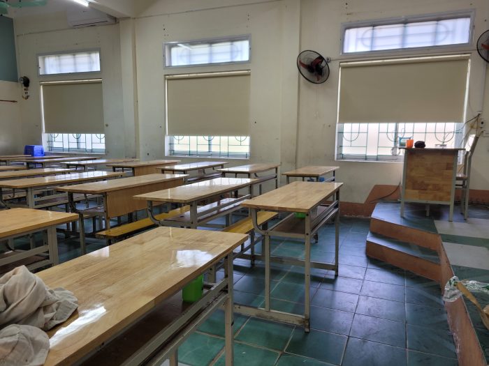 Gợi ý chọn rèm: Rèm cuốn che nắng là lựa chọn phù hợp cho lớp học: chắn sáng hiệu quả, bền, dễ vệ sinh và không chiếm diện tích.